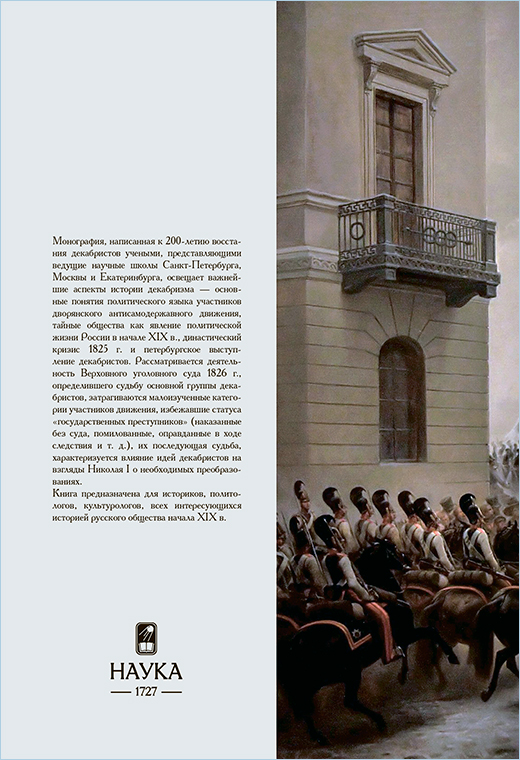 Монография отражает актуальные направления современной историографии, освещает такие аспекты истории декабризма, как основные понятия политического языка участников дворянского антисамодержавного движения, тайные общества как явление политической жизни России в начале XIX в., династический кризис 1825 г. и петербургское выступление декабристов. Рассматривается деятельность Верховного уголовного суда 1826 г., определившего судьбу основной группы декабристов, затрагиваются малоизученные категории участников движения, избежавшие статуса «государственных преступников» (наказанные без суда, помилованные, оправданные в ходе следствия и т. д.), их последующая судьба, характеризуется влияние идей декабристов на взгляды Николая I о необходимых преобразованиях.